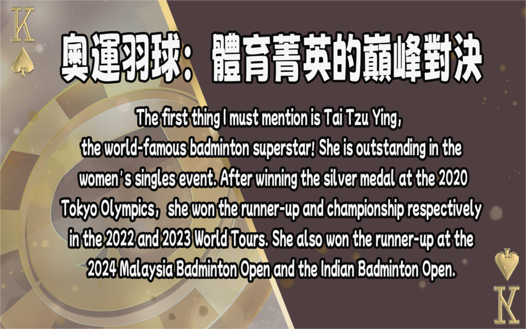 The first thing I must mention is Tai Tzu Ying, the world-famous badminton superstar! She is outstanding in the women’s singles event. After winning the silver medal at the 2020 Tokyo Olympics, she won the runner-up and championship respectively in the 2022 and 2023 World Tours. She also won the runner-up at the 2024 Malaysia Badminton Open and the Indian Badminton Open. , always showing excellent strength. In the latest Olympic standings, Xiao Dai currently has 92,736 points, surpassed by Japanese star Akane Yamaguchi, temporarily ranked fourth. However, with her experience and proficient skills, it is only a matter of time before she is admitted to the Olympics. I believe she will definitely Can fight for Taiwan on the 2024 Olympic stage!