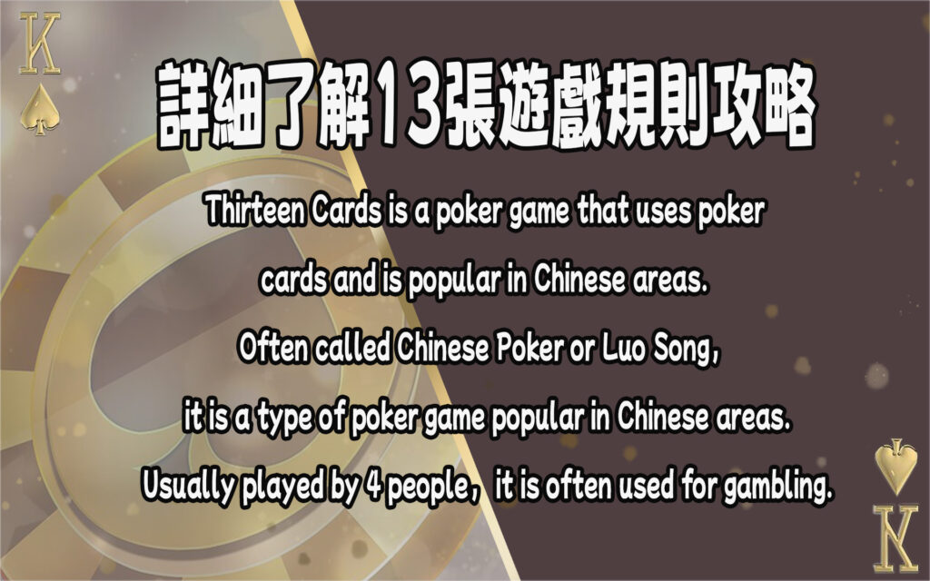 Thirteen Cards is a poker game that uses poker cards and is popular in Chinese areas. Often called Chinese Poker or Luo Song, it is a type of poker game popular in Chinese areas. Usually played by 4 people, it is often used for gambling.