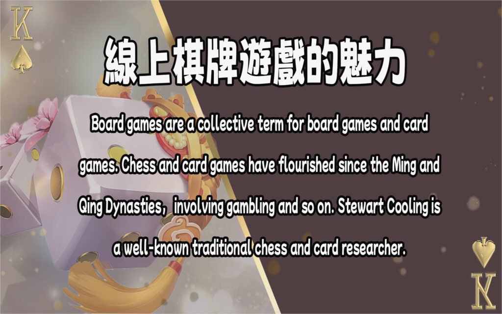 Board games are a collective term for board games and card games. Chess and card games have flourished since the Ming and Qing Dynasties, involving gambling and so on. Stewart Cooling is a well-known traditional chess and card researcher. Modern chess and card games are mainly leisure, and the ones that have a deep impact in the Chinese-speaking area include poker, Landlord, Mahjong, Chinese chess, Chinese checkers, military chess, Othello, backgammon, etc. This type of game particularly affects mobile game development, with non-action games being the mainstream.